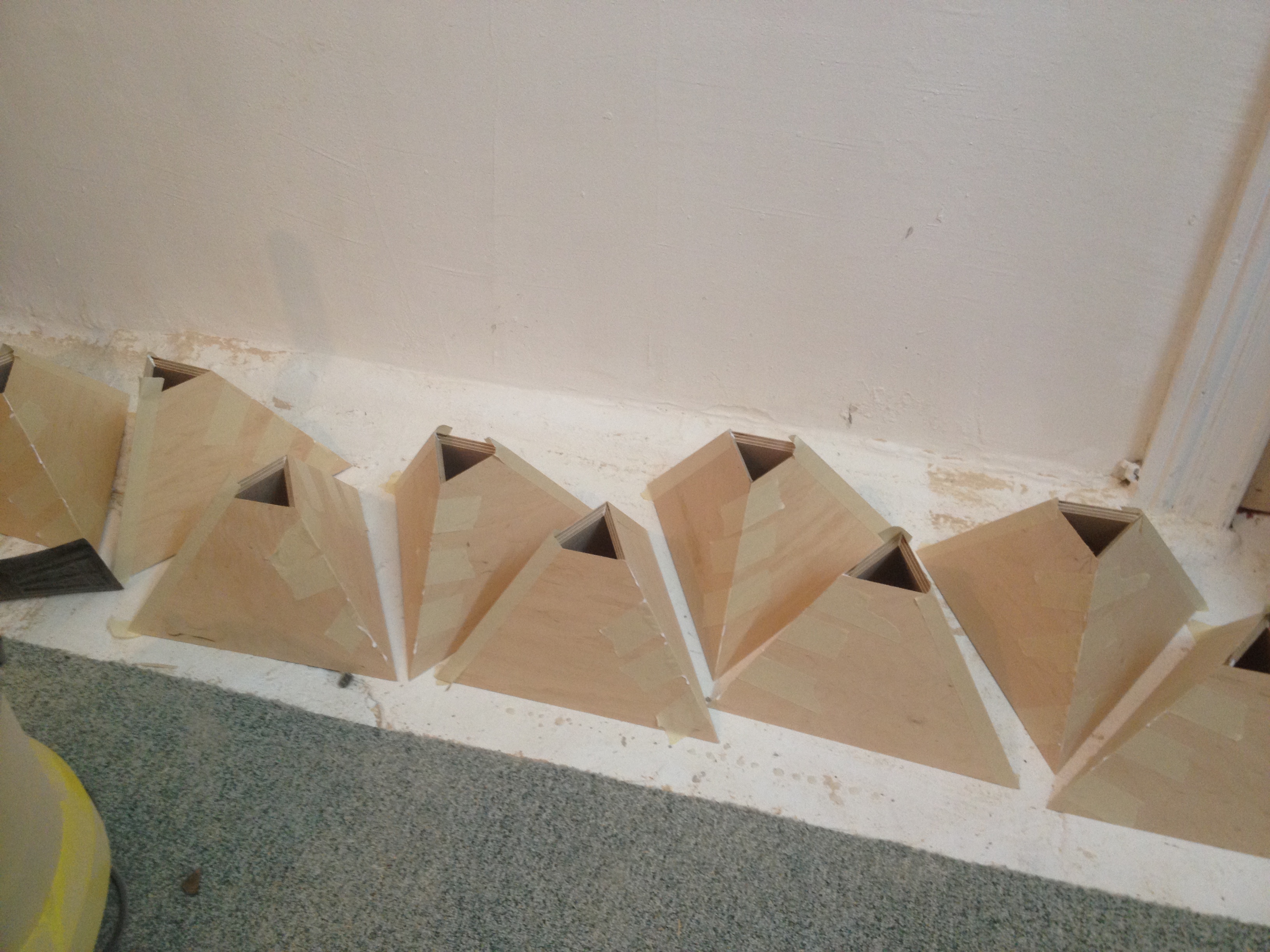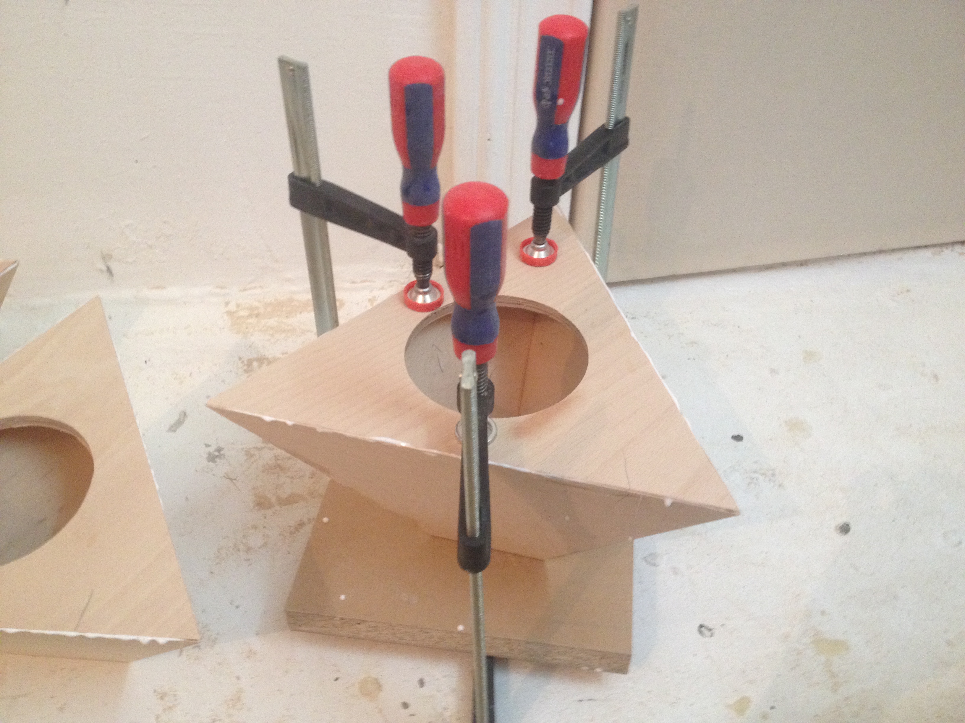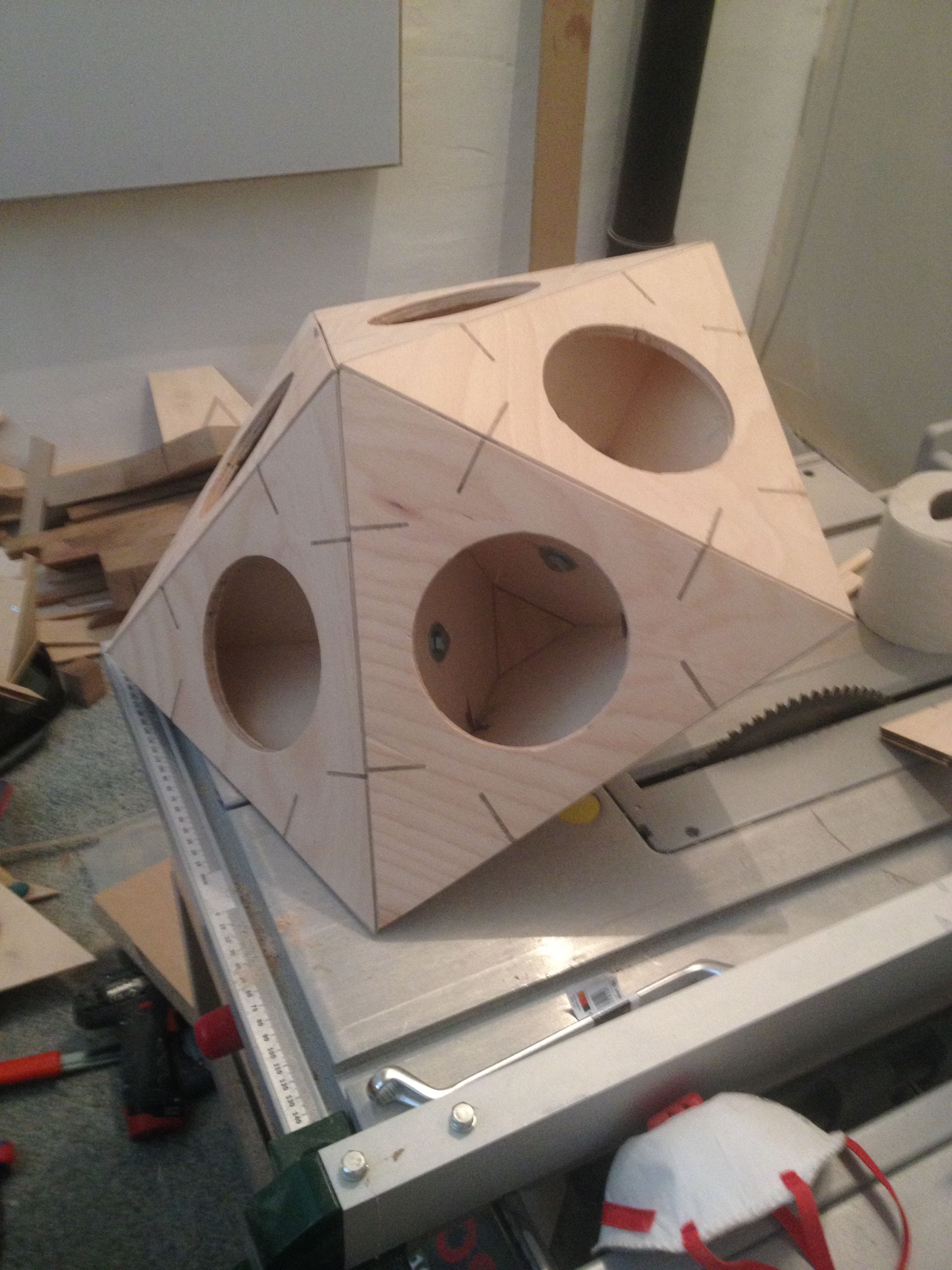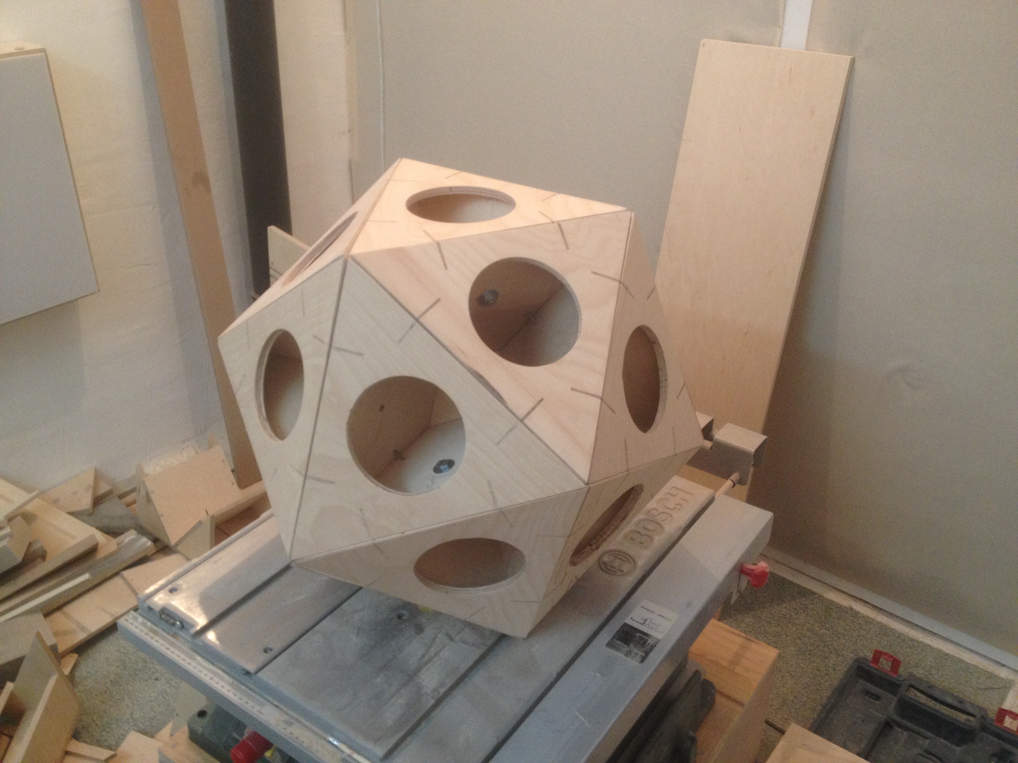 After I was about 98% sure that I figured out the dimensions and angles of the 20 speaker cases correctly, the biggest challenge in this project would be to actually build them. The problem was, that only after I would have build all cases, I could be completely sure that I didn’t miscalculate anything or that I was precise enough in the building process. When one side of the triangle needs to be 36 degrees and another one 34,55 degree, you wanna make sure, you’re as accurate as possible. Worst case scenario: you have 20 awkwardly shaped speaker cases, that do not fit into one icosahedral object.