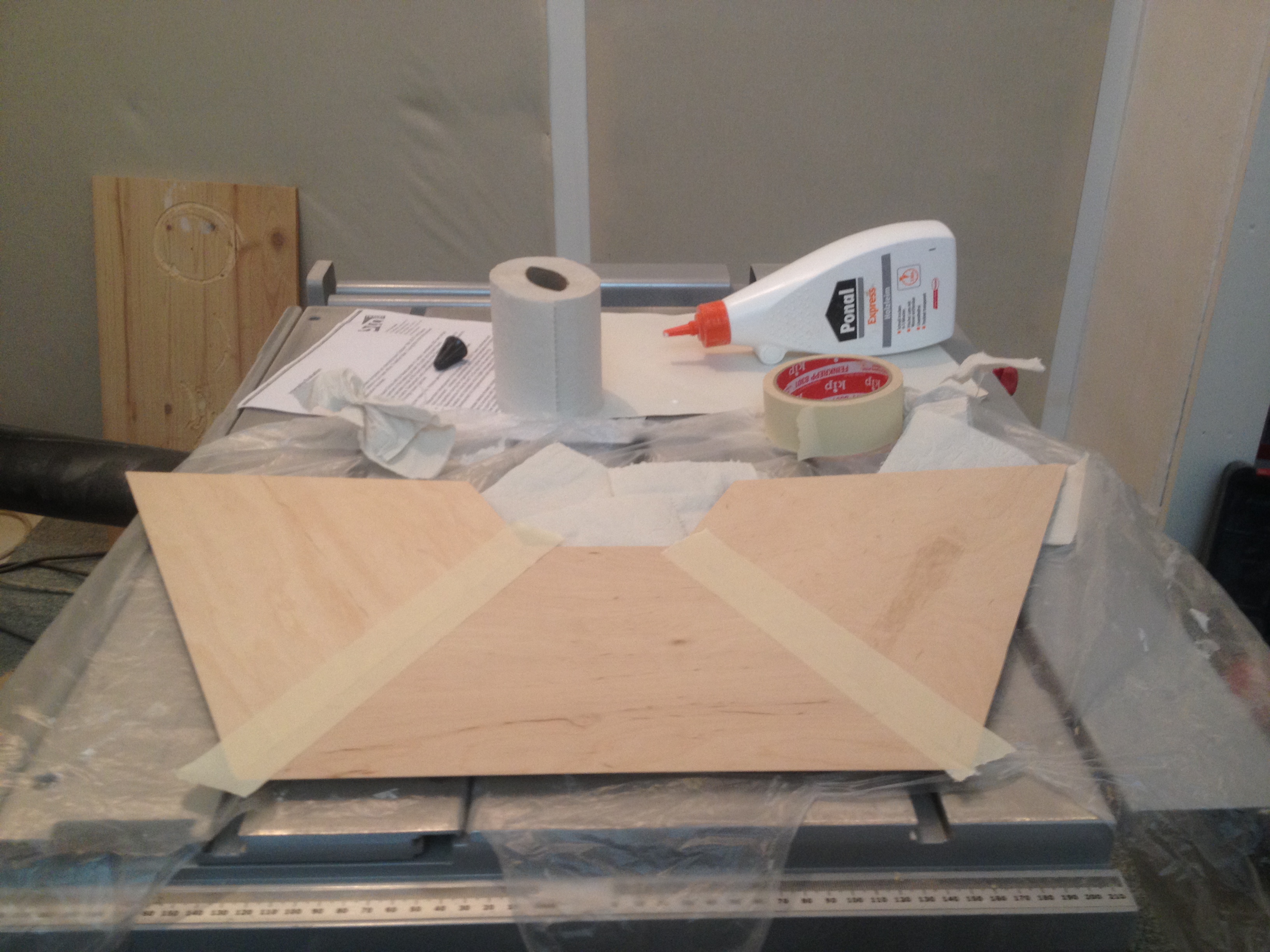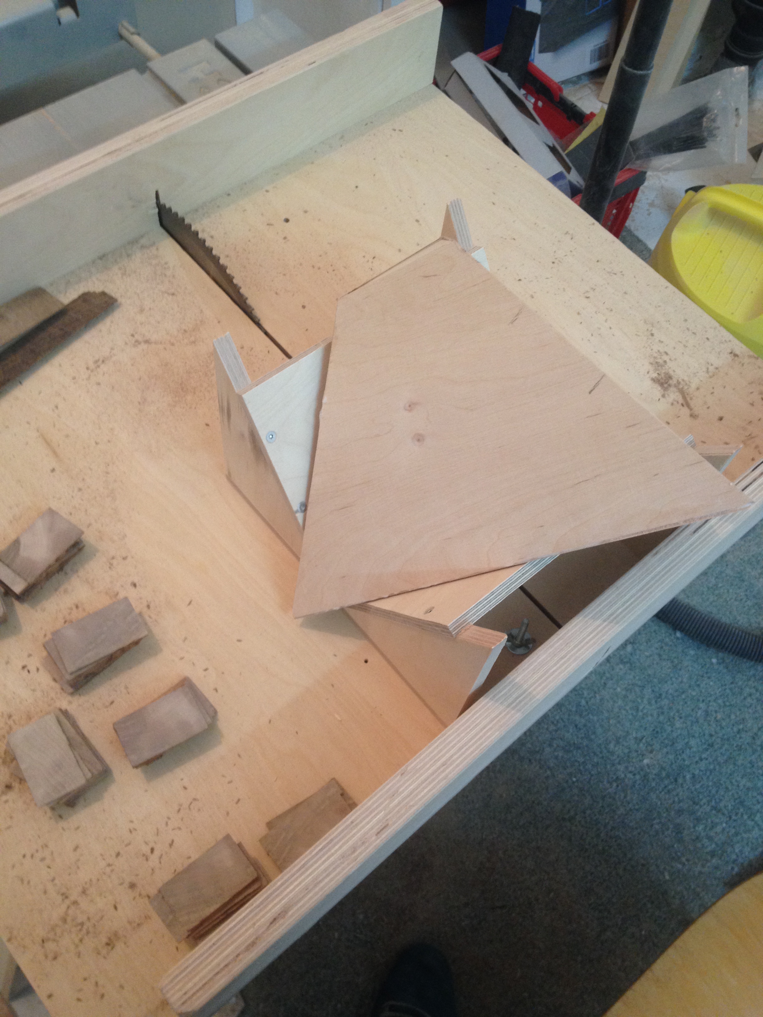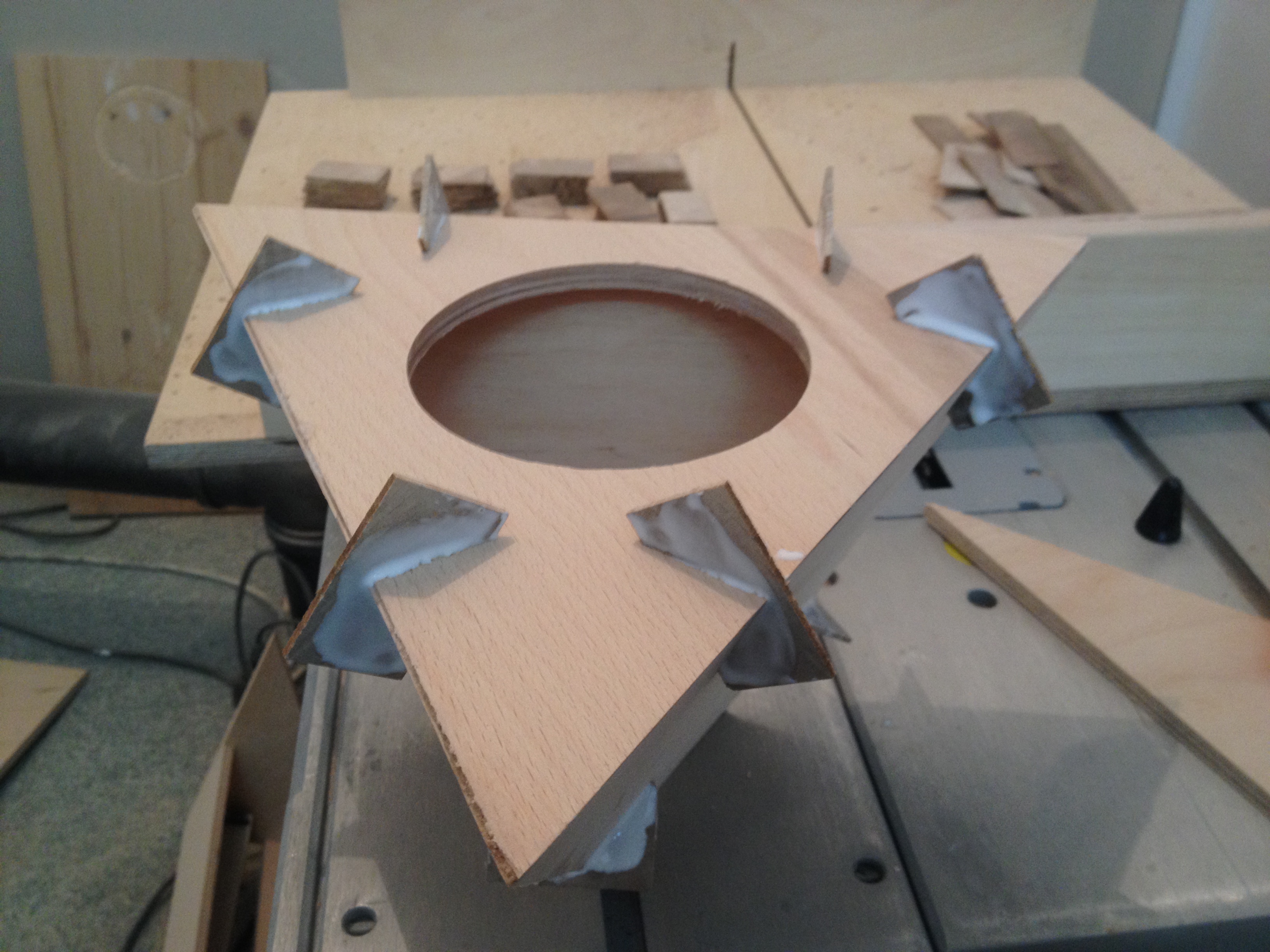 Of course I also needed some things for the construction. First of all, I rented a tiny room as a workshop. Then I had to buy some tools like a table saw, an orbital sander, some handsaws and chisels. It took some time to build all the jigs I needed to actually start working on a prototype case. The angle cutting jigs worked like a charm. I had built a few versions till I decided on the final dimensions. The prototype looked really cool, since a pyramid is a quite unusual shape for a speaker. (I’m a little proud about the walnut corner braces).